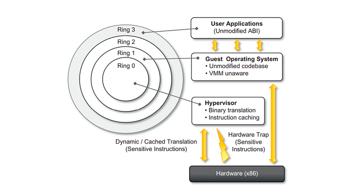 VMware is built upon the principle of full virtualization, which involves duplicating the underlying hardware and presenting it to the guest OS. The guest OS operates without any awareness of this abstraction layer and requires no modifications.